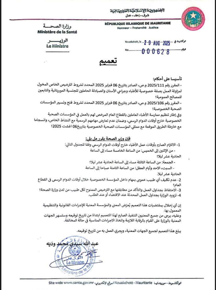 تُعلم وزارة الصحة المواطنين الموريتانيين بأنه تم تسجيل ثلاث حالات مؤكدة من حمى الوادي المتصدع أدت – للأسف – إلى وفاة المصابين، وذلك في ولايات اترارزه (روصو)، ولبراكنة (ألاك)، ولعصابة (كيفه).