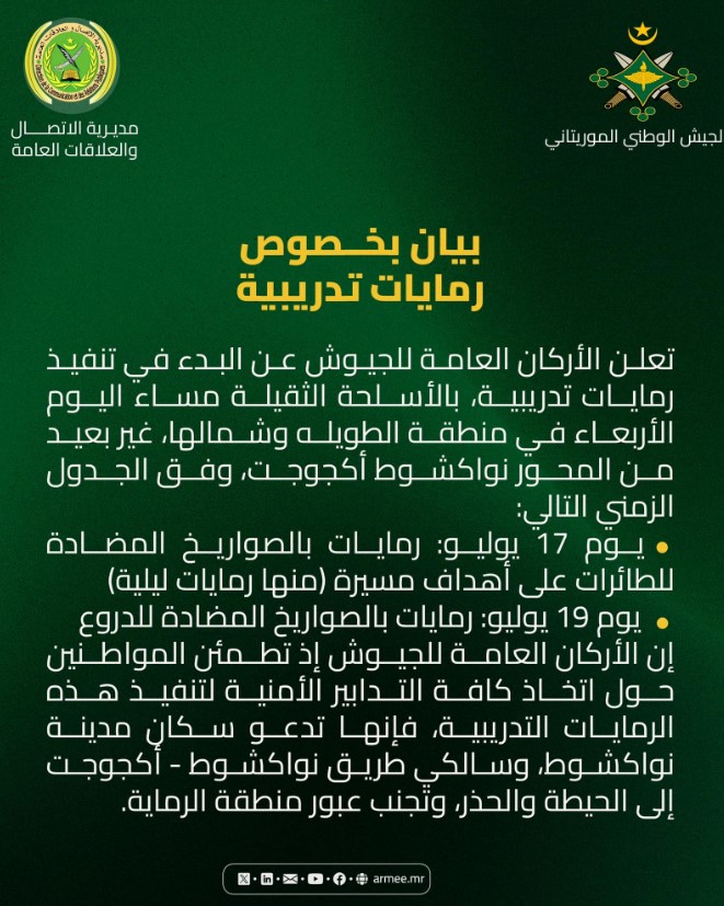 تعلن الأركان العامة للجيوش عن البدء في تنفيذ رمايات تدريبية، بالأسلحة الثقيلة مساء اليوم الأربعاء في منطقة الطويله وشمالها، غير بعيد من المحور الطرقي الرابط بين نواكشوط -أكجوجت. وفق الجدول الزمني التالي: