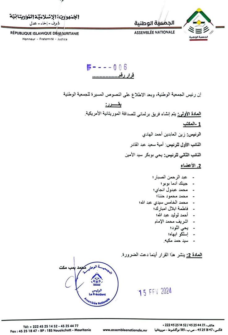 رفض نواب في الجمعية الوطنية الزج بأسمائهم في وثيقة موقعة باسم رئيس الجمعية الوطنية، تقضي بإنشاء فريق برلماني للصداقة بين موريتانيا وأمريكا.