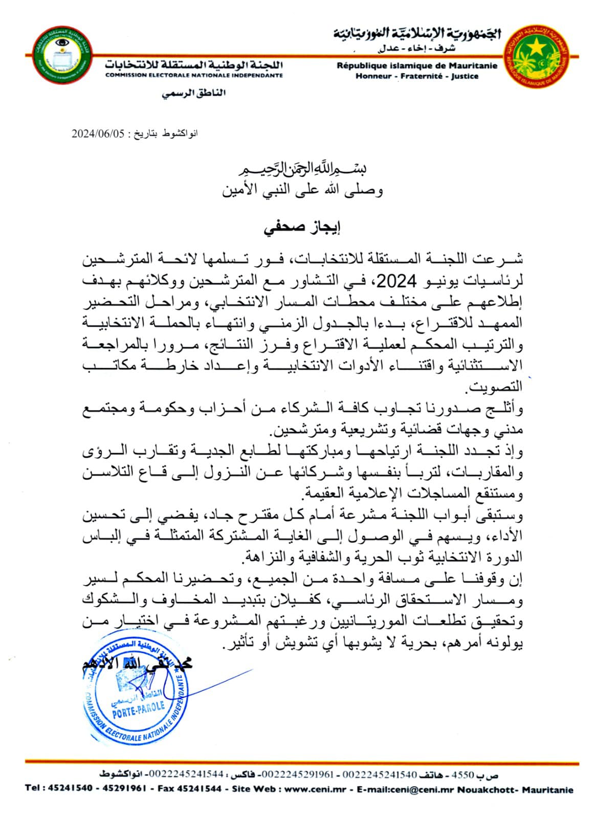 شرعت اللجنة المستقلة للانتخابات، فور تسلمها لائحة المترشحين لرئاسيات يونيو 2024، في التشاور مع المترشحين ووكلائهم بهدف إطلاعهم على مختلف محطات المسار الانتخابي، ومراحل التحضير الممهد للاقتراع، بدءا بالجدول الزمني وانتهاء بالحملة الانتخابية والترتيب المحكم لعملية الاقتراع وفرز النتائج، مرورا بالمراجعة الاستثنائية واقتناء الأدوات الانتخابية وإعداد خارطة مكاتب التصويت.