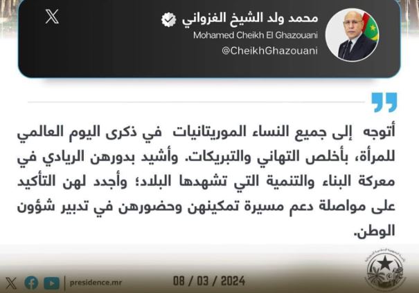 “أتوجه إلى جميع النساء الموريتانيات في ذكرى اليوم العالمي للمرأة، بأخلص التهاني والتبريكات. وأشيد بدورهن الريادي في معركة البناء والتنمية التي تشهدها البلاد؛ وأجدد لهن التأكيد على مواصلة دعم مسيرة تمكينهن وحضورهن في تدبير شؤون الوطن”.