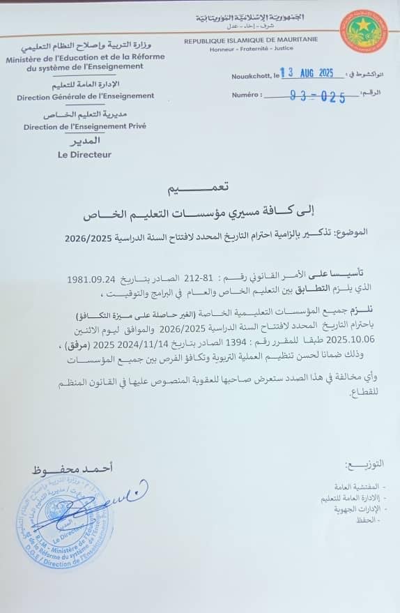 أصدرت مديرية التعليم الخاص بوزارة التربية وإصلاح النظام التعليمي، اليوم مقررا يلزمجميع مؤسسات التعليم الخاص باحترام التاريخ المحدد لافتتاح السنة الدراسية 2025/2026، والذي يوافق يوم الاثنين 06 أكتوبر 2025.