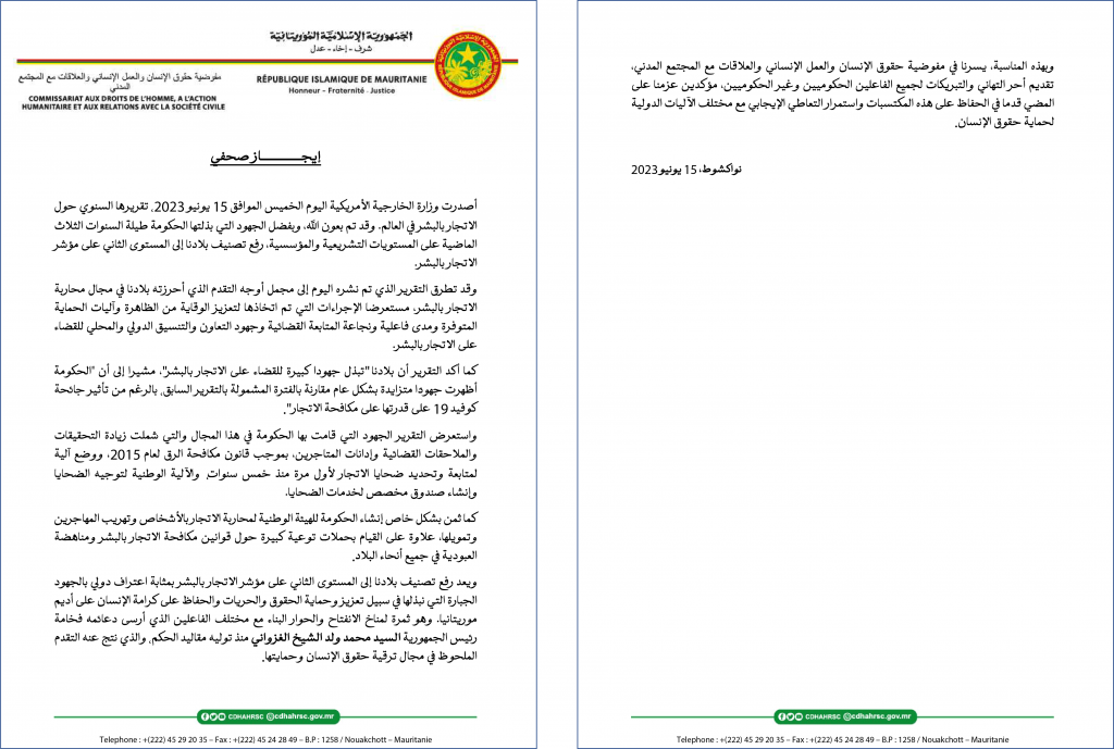أصدرت وزارة الخارجية الأمريكية اليوم الخميس الموافق 15 يونيو 2023، تقريرها السنوي حول الاتجار بالبشر في العالم. وقد تم بعون الله، وبفضل الجهود التي بذلتها الحكومة طيلة السنوات الثلاث الماضية على المستويات التشريعية والمؤسسية، رفع تصنيف بلادنا إلى المستوى الثاني على مؤشر الاتجار بالبشر.