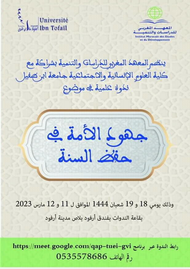 ينظم المعهد المغربي للدراسات والتنمية بشراكة مع كلية العلوم الإنسانية والاجتماعية جامعة ابن طفيل بالقنيطرة ندوة علمية في موضوع "جهود الأمة في حفظ السنة" ، وذلك يومي 18 و19 شعبان 1444 الموافق ل 11 و 12 مارس 2023 في فندق أرفود بلاص بمدينة أرفود جنوب شرق المملكة المغربية.