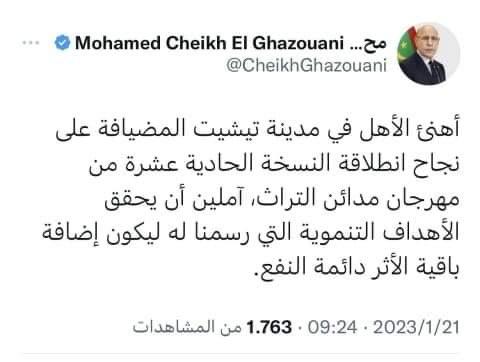 "أهنئ الأهل في مدينة تيشيت المضيافة على نجاح انطلاقة النسخة الحادية عشرة من مهرجان مدائن التراث، آملين أن يحقق الأهداف التنموية التي رسمنا له ليكون إضافة باقية الأثر، دائمة النفع".