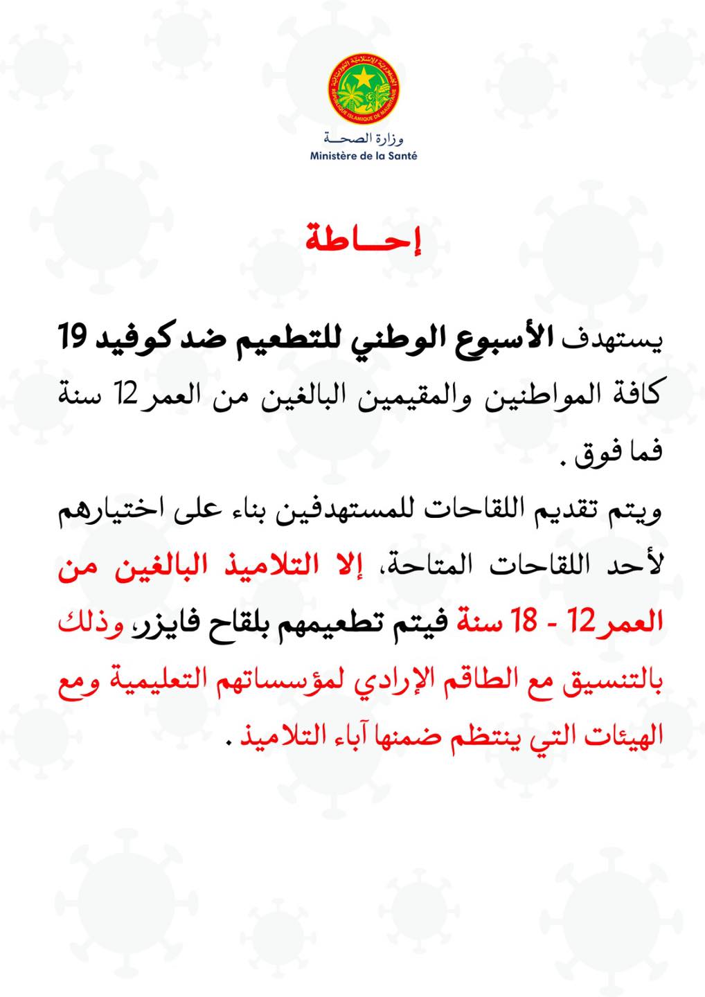 يستهدف الأسبوع الوطني للتطعيم ضد كوفيد 19 كافة المواطنين والمقيمين البالغين من العمر 12 سنة فما فوق.
