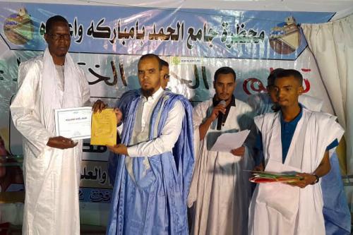 أشرف والي آدرار، جاك عبد الرزاق، الليلة البارحة في مدينة أطار، على حفل تكريم 44 فائزا في مسابقة حفظ القرآن الكريم والفقه المالكي، المنظمة من طرف محظرة مسجد الحمد.