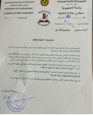 أعلن مجلس جائزة شنقيط اليوم الأربعاء أسماء الفائزين بالجائزة لسنة 2025.