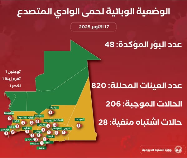 وقد سجلت المصالح البيطرية، حتى اليوم 17 اكتوبر 2025، ما مجموعه 48 بؤرة موزعة على 23 مقاطعة تتبع لعشر ولايات، كما هو موضح في الصورة.