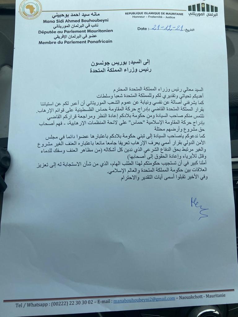 الفكر (نواكشوط) سلمت النائبة مانه سيد أحمد بوحبيني، اليوم الثلثاء السفير البريطاني لدى موريتانيا، خلال لقاء لها مع الأخير، رسالة موجهة إلى رئيس الحكومة البريطانية بوريس جونسون، حصل موقع الفكر على نسخة منها، عبرت خلالها عن استيائها واستياء عموم الشعب الموريتاني إثر قرار المملكة المتحدة القاضي بإدراج حركة المقاومة الإسلامية “حماس" على قوائم الإرهاب.