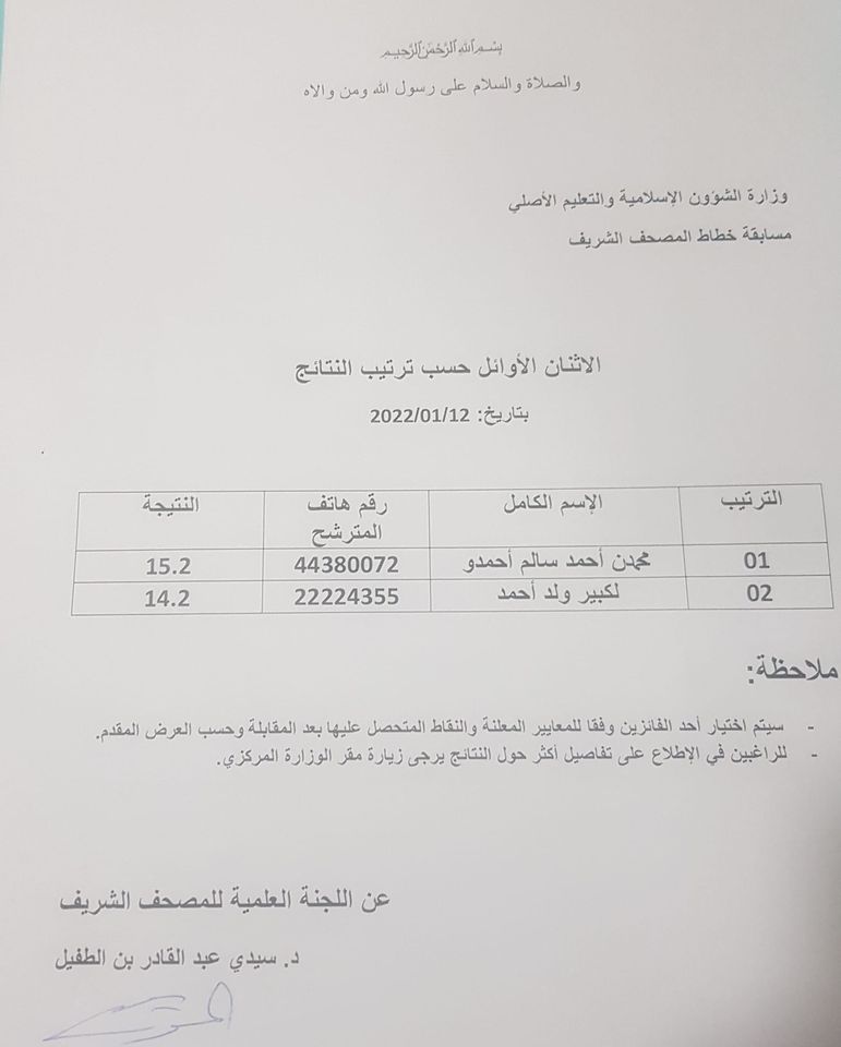 وجاء في مقرر النتائج الذي نشرت الوزارة - بتوقيع د. سيدي عبد القادر بن الطفيل عن اللجنة العلمية للمصحف الشريف - تحديد الفائزين الذين حظيا بالتفوق وهما: