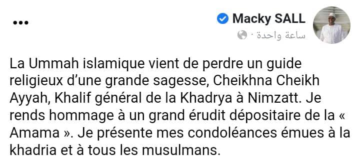وقال الرئيس صال "إن الأمة الإسلامية فقدت زعيمًا دينيًا يتمتع بقدر عظيم من الحكمة، شيخنا الشيخ آياه، الخليفة العام للطريقة القادرية في النمجاط”.