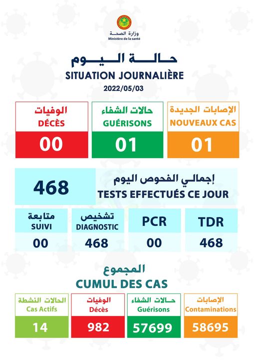 وبينت الوزارة في نشرتها اليومية حول وضعية كورونا، أنها توصلت بهذه النتيجة بعد إجراء 468 فحصا على عموم البلاد.