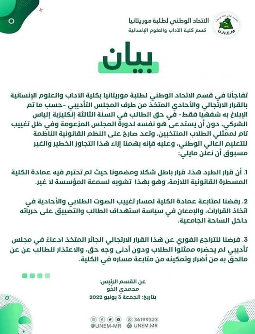 تفاجأنا في قسم الاتحاد الوطني لطلبة موريتانيا بكلية الآداب والعلوم الإنسانية بالقرار الارتجالي والأحادي المتخذ من طرف المجلس التأديبي -حسب ما تم الإبلاغ به شفهيا فقط- في حق الطالب في السنة الثالثة إنكليزية إلياس الشركي، دون أن يستدعى هو نفسه لدورة المجلس المزعومة وفي ظل تغييب تام لممثلي الطلاب المنتخبين، وتعد صارخ على النظم القانونية الناظمة للتعليم العالي الوطني، وعليه فإنه يهمنا إزاء هذا التجاوز الخطير والغير مسبوق أن نعلن مايلي: