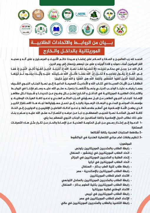 أصدرت عدة اتحادات طلابية موريتانية بيانا مشتركا نددت فيه بالإساءة للجناب النبوي الشريف وذلك بعد تصريحات الناطق باسم الحزب الحاكم في الهند.