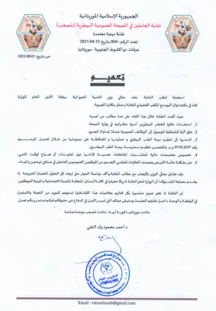 قالت نقابة العاملين في الصحة العمومية البيطرية إن وزير التنمية الحيوانية محمد ولد اسويدات تفاعل بالإيجاب مع مطالبها، وأكد مواصلة الحوار حتى إيجاد حلول للقضايا المطروحة.