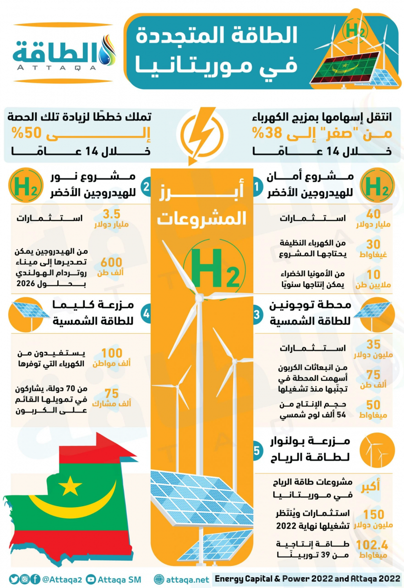 ويوضح التصميم التالي أبرز مشروعات الطاقة المتجددة في موريتانيا، أعدّته وحدة أبحاث الطاقة، استنادًا إلى المعلومات التي نشرها موقع "إنرجي كابيتال أند باور":