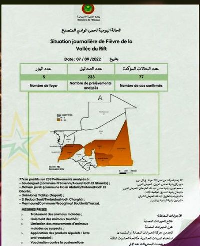 أعلنت وزارة التنمية الحيوانية أمس الأربعاء في نشرتها حول الحالة اليومية لحمى الوادي المتصدع، عن وجود 77 حالة إصابة مؤكدة، بعد إجراء 233 فحصا، كما أكدت الوزارة على وجود 5 بؤر للمرض، في كل من الحوضين وتكانت والترارزة.