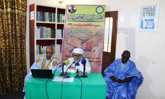 نظم مجلس اللسان العربي، أمس الثلاثاء، بمقره في نواكشوط، محاضرة تناولت موضوع : “المعالجة الدلالية في معجم مقاييس اللغة”، ألقاها الدكتور المختار الجيلاني.