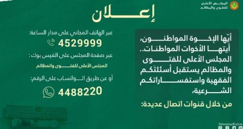 المجلس الأعلى للفتوى والمظالم يستقبل أسئلتكم الفقهية واستفساراتكم الشرعية من خلال قنوات اتصال عديدة: