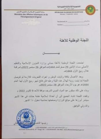 أعلنت لجنة مراقبة الأهلة في موريتانيا، مساء اليوم الاثنين، عدم توصلها لما يثبت رؤية هلال شهر ربيع الأول من العام الهجري 1444.