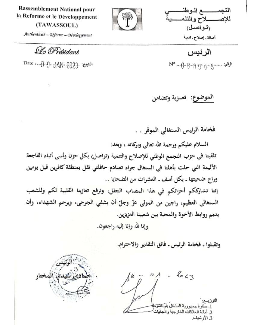 وجه رئيس حزب التجمع الوطني للإصلاح والتنمية - تواصل حمادي ولد سيد المختار الملقب أمادي رسالة للرئيس السنغالي ماكي صال يعزيه من خلالها في ضحايا حادث المرور المأساوي الذي وقع قبل يومين وراح ضحيته بكل أسف العشرات من أبناء الشعب السنغالي.