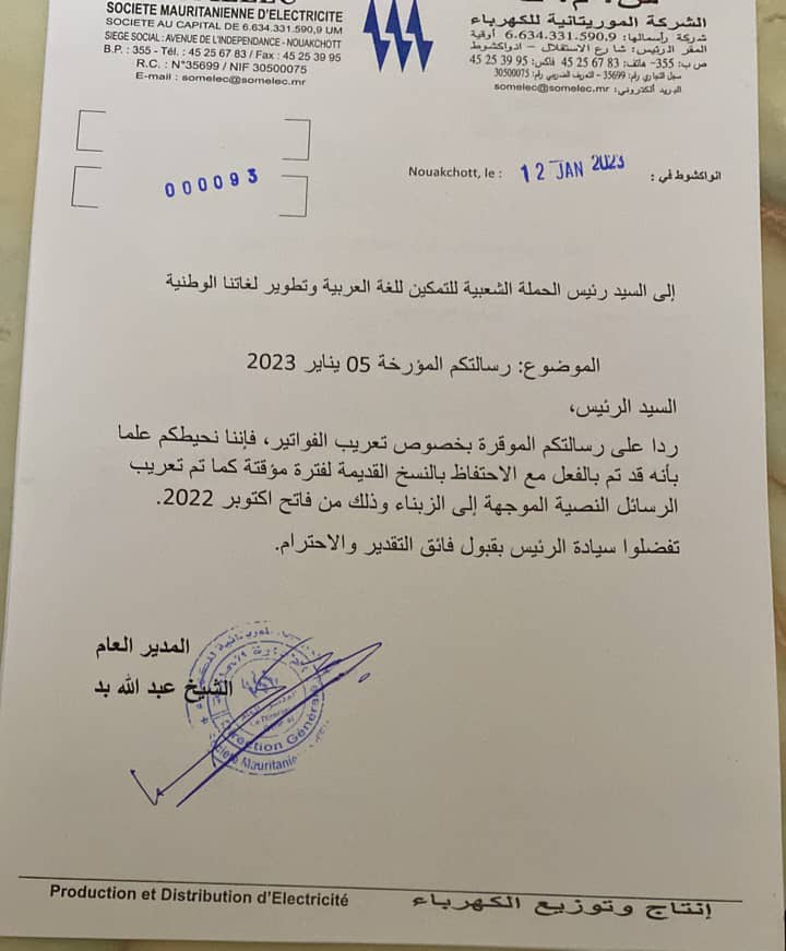 توصلت الحملة الشعبية للتمكين للغة العربية وتطوير لغاتنا الوطنية يوم 12 يناير 2023 برد من المدير العام للشركة الموريتانية للكهرباء على رسالتها المتعلقة بتعريب فواتير الشركة، والتي كانت قد أرسلتها للشركة بتاريخ 05 يناير 2023.