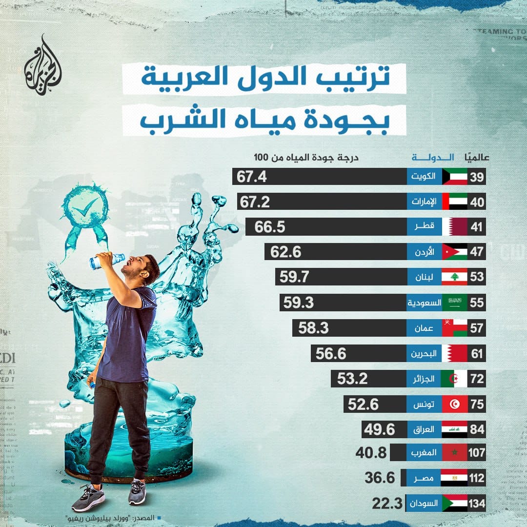 حلت الكويت في المرتبة الأولى عربيا على مستوى جودة مياه الشرب تلتها الأمارات ثم قطر والأردن ولبنان فيما كانت الجزائر الأولى مغاربيا جاءت بعدها المغرب ثم تونس ولم يشمل التصنيف كلا من موريتانيا وليبيا