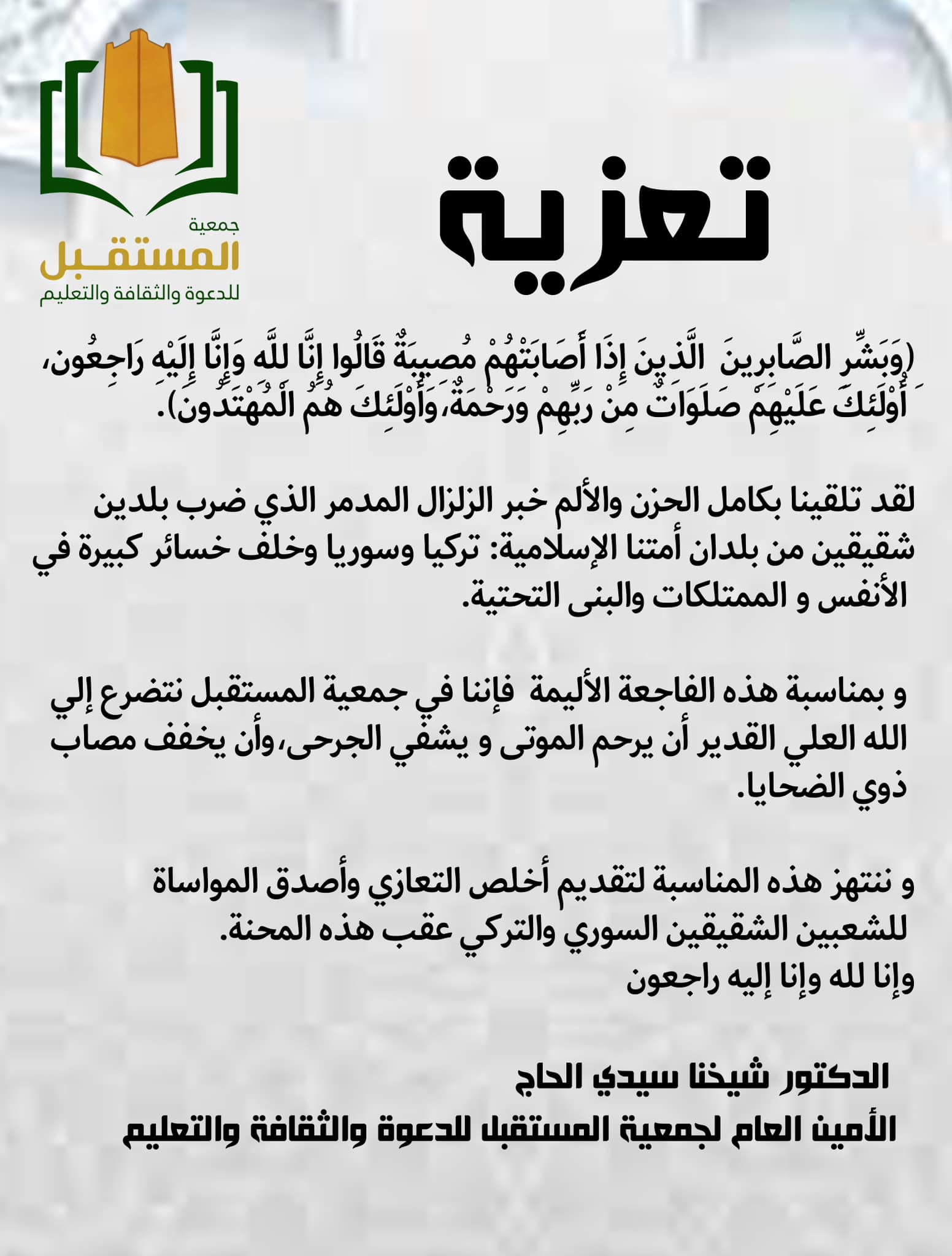 لقد تلقينا بكامل الحزن والألم خبر الزلزال المدمر الذي ضرب بلدين شقيقين من بلدان أمتنا الإسلامية : تركيا وسوريا، وخلف خسائر كبيرة في الأنفس و الممتلكات والبنى التحتية.