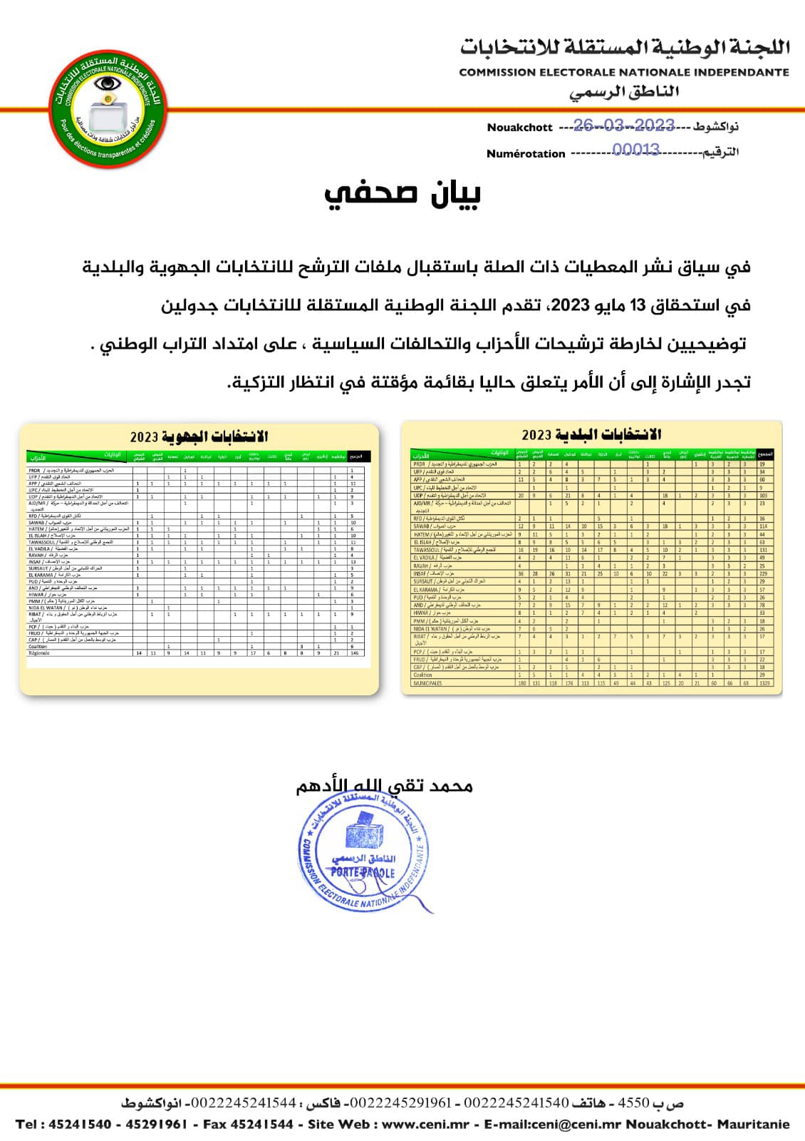 نشرت اللجنة الوطنية المستقلة للانتخابات على موقعها الإلكتروني صباح اليوم بيانا صحفيا يحدد خارطة ترشيحات الأحزاب السياسية للانتخابات الجهوية والبلدية المرتقبة، في 13مايو 2023.