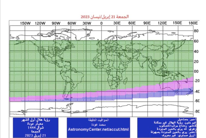 وقال مدير المركز، محمد عودة، إن دول العالم الإسلامي ستتحرى هلال شهر شوال الخميس 20 أبريل، ورؤية الهلال في ذلك اليوم غير ممكنة بالعين المجردة أو بالتلسكوب من جميع أنحاء قارتي آسيا وأستراليا.