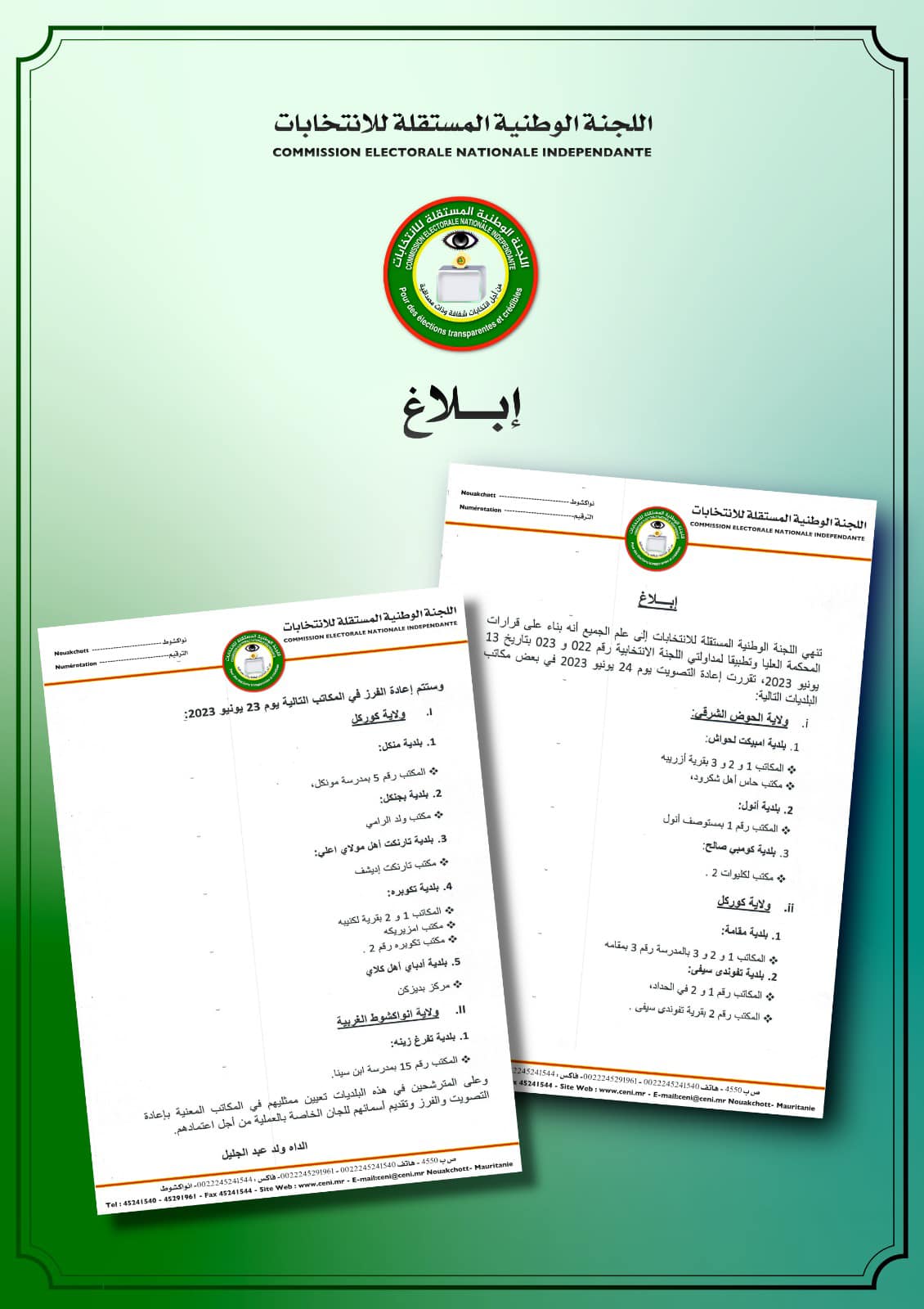 وتقررت إعادة التصويت يوم 24 من الجاري في أربع مكاتب ببلدية انبيكت لحواش ومكتب واحد ببلدية آنول ومكتب واحد ببلدية كومبي صالح فيما يخص ولاية الحوض الشرقي