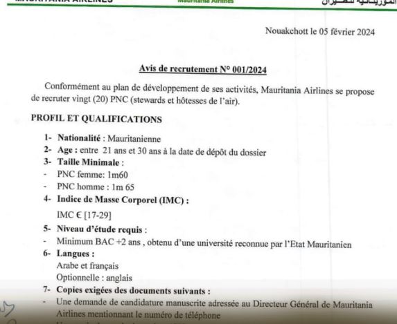 أعلنت شركة الموريتانية للطيران عن اكتتاب 20 فردا من أطقم الضيافة الجوية، وفق ما قالت إنه استمرار لخطة تطوير أنشطتها.