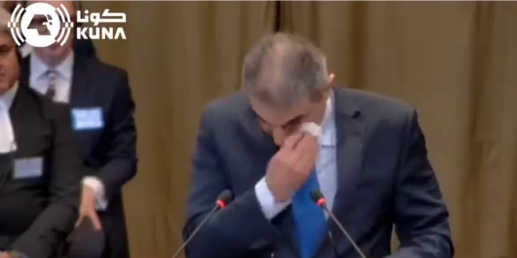 لم يتمالك سفير دولة الكويت في لاهاي، علي الظفيري، دموعه وهو يتحدث عن الوضع في قطاع غزة، خلال كلمة له خلال جلسة استماع تعقدها محكمة العدل الدولية بمدينة لاهاي، الخميس 22 فبراير 2024، بناءً على طلب من الجمعية العامة للأمم المتحدة.