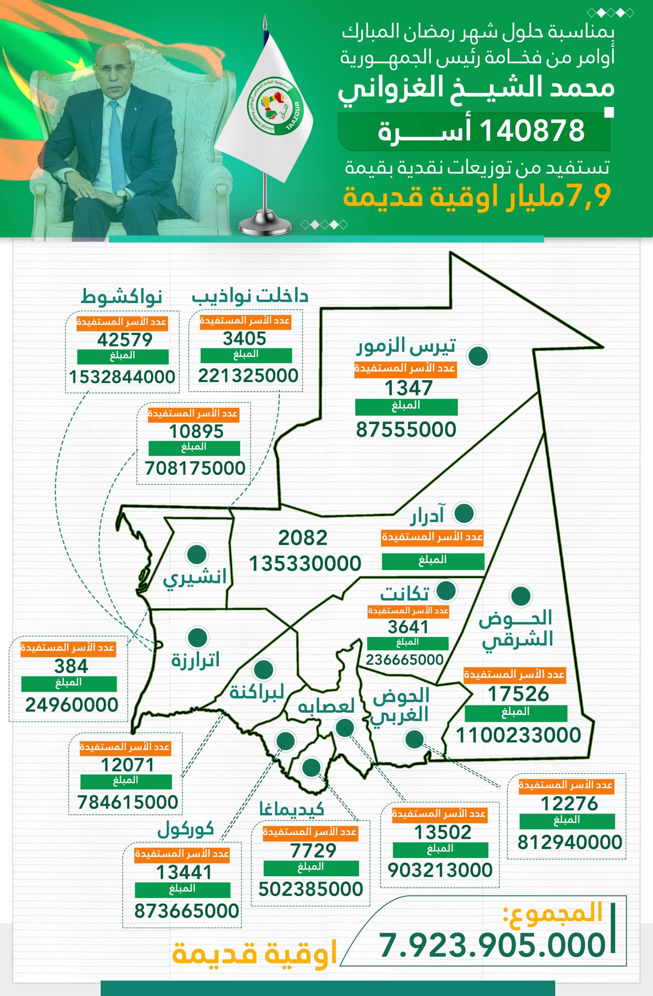 التوزيعات الجديدة التي تبلغ 7.923.905.000 أوقية قديمة وتستهدف 140878 أسرة متعففة جاءت بتعليمات من رئيس الجمهورية.