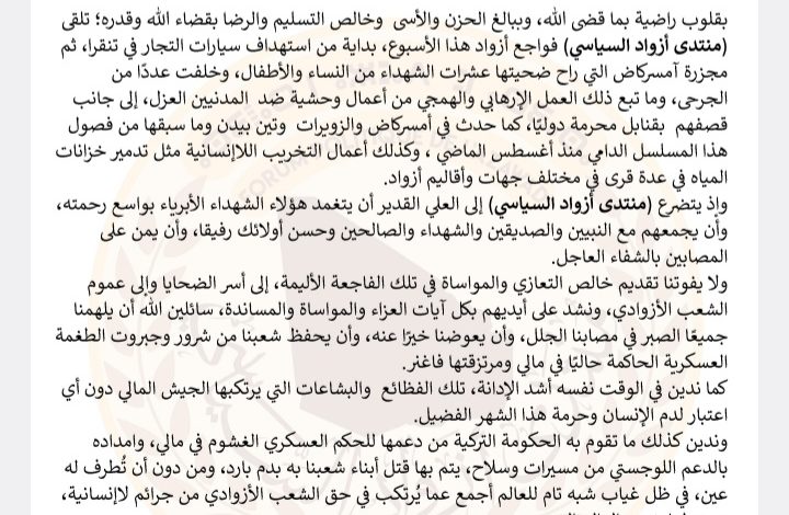 ولفت المنتدى، في بيان تناقلته مواقع إخبارية -إلى أن هذا الأمر يحصل “في ظل غياب شبه تام للعالم أجمع عما يرتكب في حق الشعب الأزوادي من جرائم لا إنسانية، يندى لها ضمير العالم الحر”.
