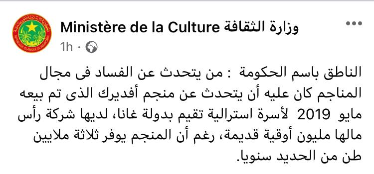 نشرت وزارة الثقافة على صفحتها كلاما مقتضبا لوزير الثقافة الناطق باسم الحكومة خلال تعليقه على اجتماع مجلس الوزراءاليوم الأربعاء، قال فيه "إن من يتحدث عن الفساد فى مجال المناجم كان عليه أن يتحدث عن منجم أفديرك الذى تم بيعه مايو 2019 لأسرة استرالية تقيم بدولة غانا، لديها شركة رأس مالها مليون أوقية قديمة، رغم أن المنجم يوفر ثلاثة ملايين طن من الحديد سنويا.