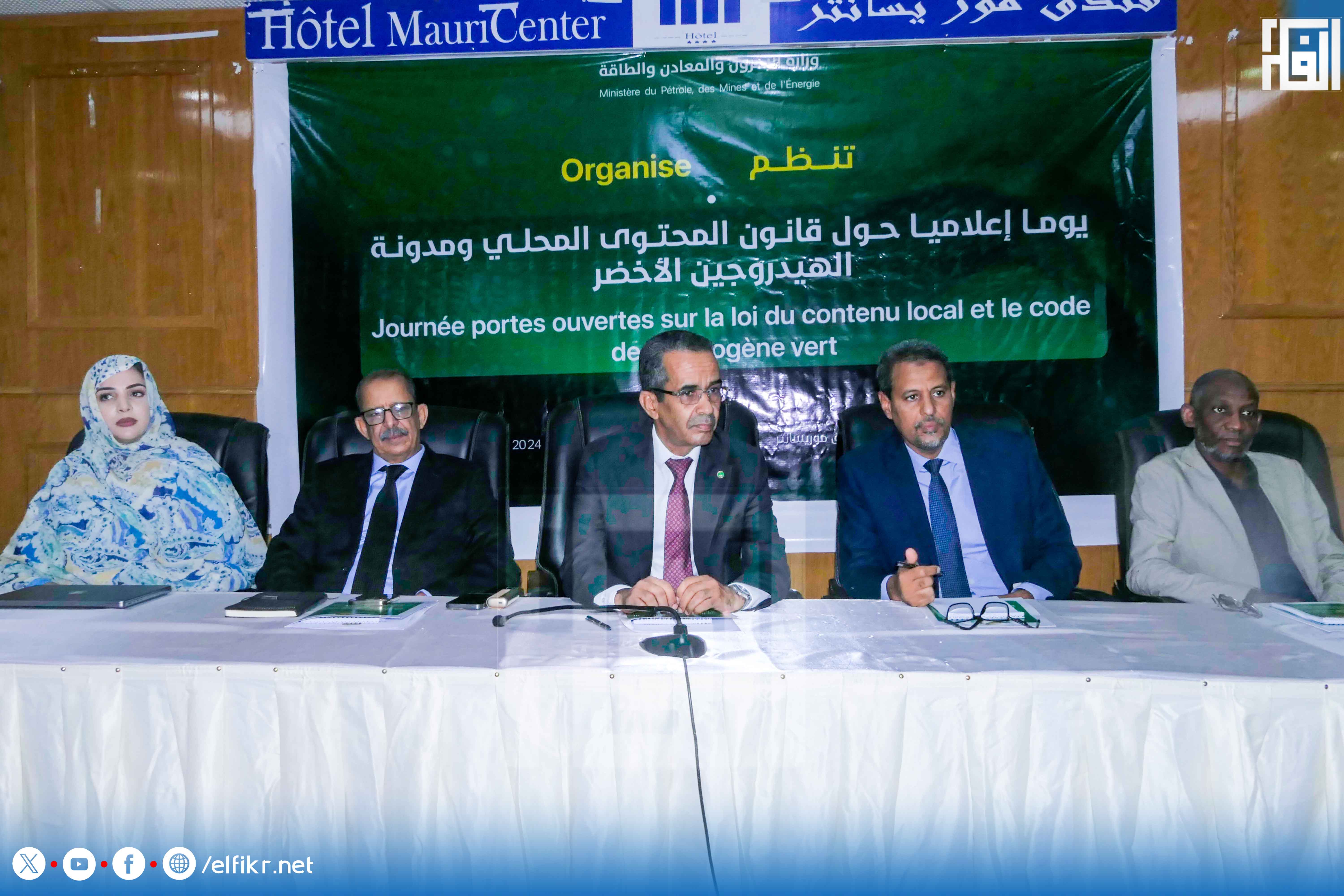 أشرف الأمين العام لوزارة البترول و الطاقة احمد سالم ولد بوهد، على حفل افتتاح يوم إعلامي عن مشروع قانون المحتوى المحلي ومدونة الهيدروجين الأخضر، منظم من طرف الوزارة، واعتبر الأمين العام: "اليوم الاعلامي فرصة لإطلاعكم ومن خلالكم الرأي العام الوطني على مضامين مشروعي قانون المحتوى المحلي للصناعات الاستخراجية والطاقة وقانون الهيدروجين الاخضر اللذين صادقا عليهما مجلس الوزراء فى اجتماعه الماضي ،حيث تمت المصادقة عليهما تنفيذا لبرنامج فخامة رئيس الجمهورية السيد محمد ولد الشيخ الغزواني الرامية الى النهوض بالاقتصاد الوطني فى مختلف قطاعاته