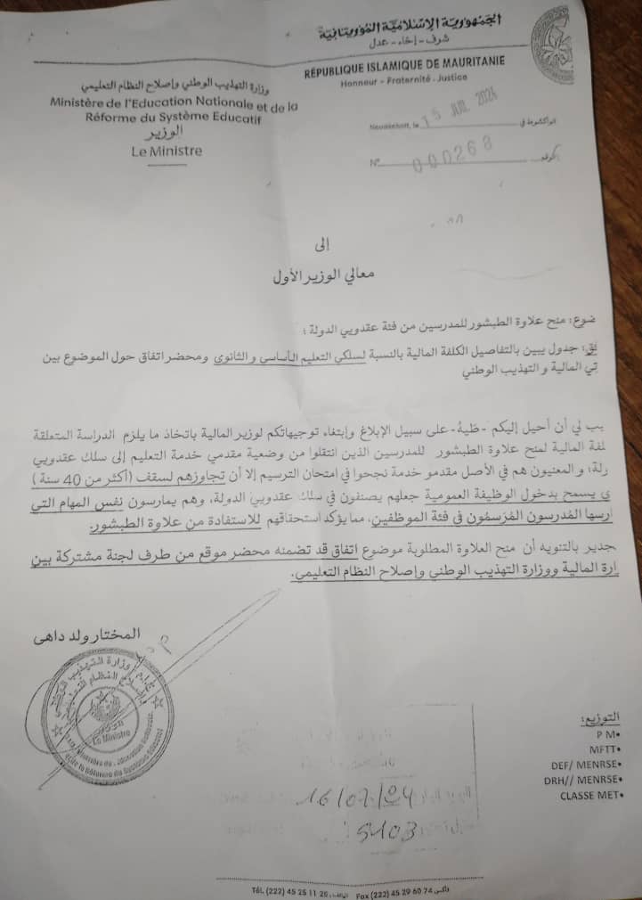 خطوات ظنها هؤلاء العقدويون المكتتبون الذين يعملون جميعا داخل البلاد في ظروف صعبة كافية قبل أن تفاجئهم الإدارة العامة للميزانية بعرقلة صرف هذه العلاوة رغم توصلها بلوائحهم من طرف الإدارات المختصة بوزارة التربية، مما عزز شعورهم بقصدية ستمرار التلاعب بعلاواتهم الأخرى من طرف وزارتي الإقتصاد والمالية والتربية وإصلاح النظام التعليمي، متأملين من الرئيس محمد ولد الشيخ الغزواني ووزيره الأول المختار ولد أجاي إلى التدخل لإنهاء هذه المعاناة المستمرة منذ نحو عامين بحق مدرسين ميدانيين.