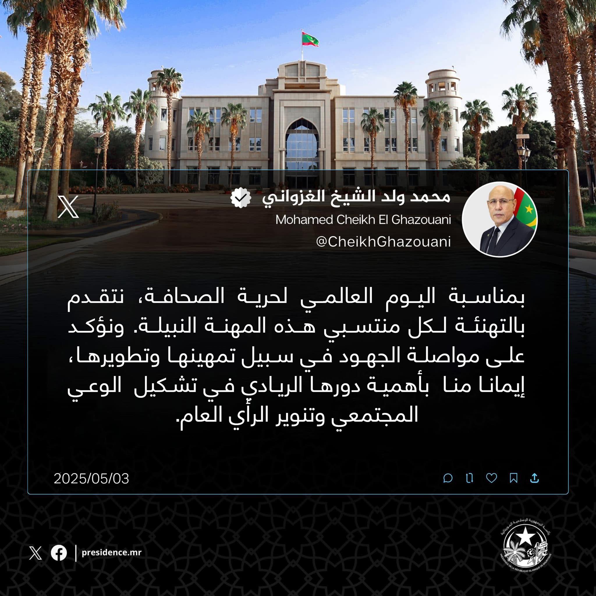 كتب رئيس الجمهورية محمد ولد الشيخ الغزواني: بمناسبة اليوم العالمي لحرية الصحافة، نتقدم بالتهنئة لكل منتسبي هذه المهنة النبيلة. ونؤكد على مواصلة الجهود في سبيل تمهينها وتطويرها، إيمانا منا بأهمية دورها الريادي في تشكيل الوعي المجتمعي وتنوير الرأي العام.