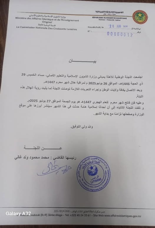 أعلنت لجنة مراقبة الاهلة في موريتاينا، أن غدا الجمعة ال27 يونيو هو فاتح شهر محرم وبداية العام الهجري 1447.