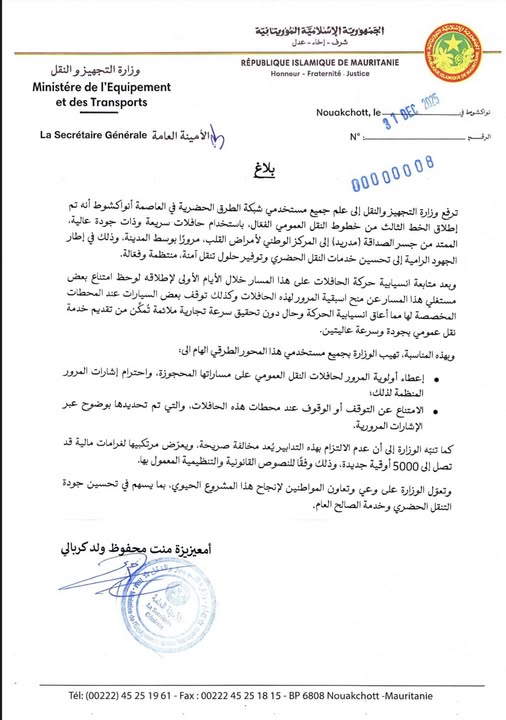 كما تنبّه الوزارة إلى أن عدم الالتزام بهذه التدابير يُعد مخالفة صريحة، ويعرّض مرتكبيها لغرامات مالية قد تصل إلى 5000 أوقية جديدة، وذلك وفقًا للنصوص القانونية والتنظيمية المعمول بها.