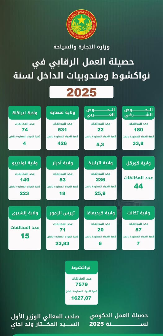 أظهرت حصيلة العمل الرقابي المنفذ في ولايات نواكشوط ومندوبيات الداخل خلال سنة 2025، من طرف وزارة التجارة والسياحة، تسجيل آلاف المخالفات ومصادرة كميات كبيرة من المواد، في إطار جهود حماية المستهلك وتنظيم السوق.