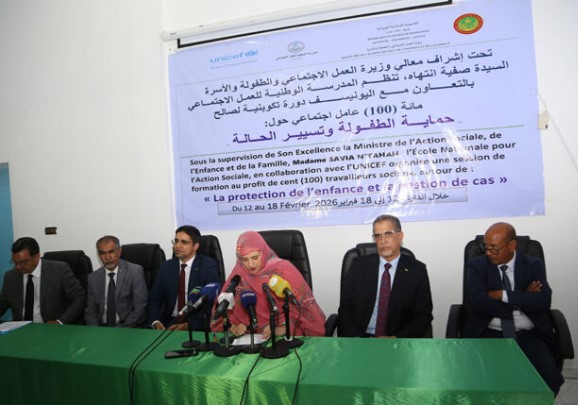 أشرفت وزيرة العمل الاجتماعي والطفولة والأسرة، صفية بنت انتهاه، رفقة وزير تمكين الشباب والتشغيل والرياضة والخدمة المدنية، محمد عبد الله ولد لولي، اليوم الخميس بالمدرسة الوطنية للعمل الاجتماعي بنواكشوط، على افتتاح دورة تكوينية حول حماية الطفولة.