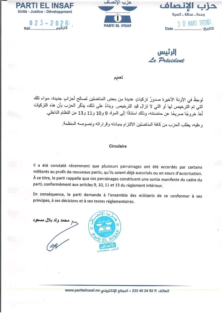 وأوضح الحزب، في تعميم موقع من رئيسه محمد ولد بلال مسعود، أنه لوحظ في الآونة الأخيرة صدور “تزكيات عديدة” من بعض المناضلين لصالح تشكيلات سياسية جديدة، مؤكدا أن ذلك يتعارض مع مقتضيات النظام الداخلي، خاصة المواد 9 و10 و11 و13.