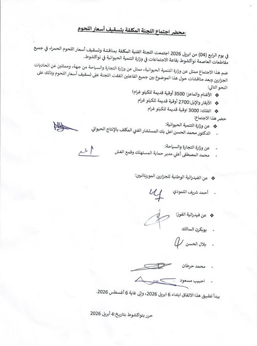 أعلن زوال اليوم السبت، في مباني وزارة التنمية الحيوانية بالعاصمة نواكشوط، عن اعتماد تسقيف لأسعار اللحوم الحمراء، سيبدأ العمل به الإثنين 6 إبريل الجاري، ويعتمد مبلغ 3500 أوقية قديمة كسعر ثابت لكيلوغرام لحم الضأن وللماعز ، و 2700 أوقية قديمة لكيلوغرام لحم الإبل والبقر، في حين يحدد 3000 أوقية قديمة كسعر لكلوغرام الفلكه.