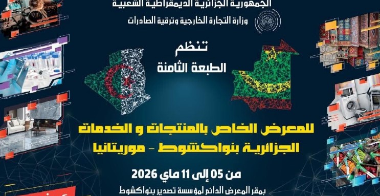 أعلنت وزارة التجارة الخارجية وترقية الصادرات عن تنظيم الطبعة الثامنة من المعرض الخاص بالمنتجات والخدمات الجزائرية، وذلك بالعاصمة الموريتانية نواكشوط.