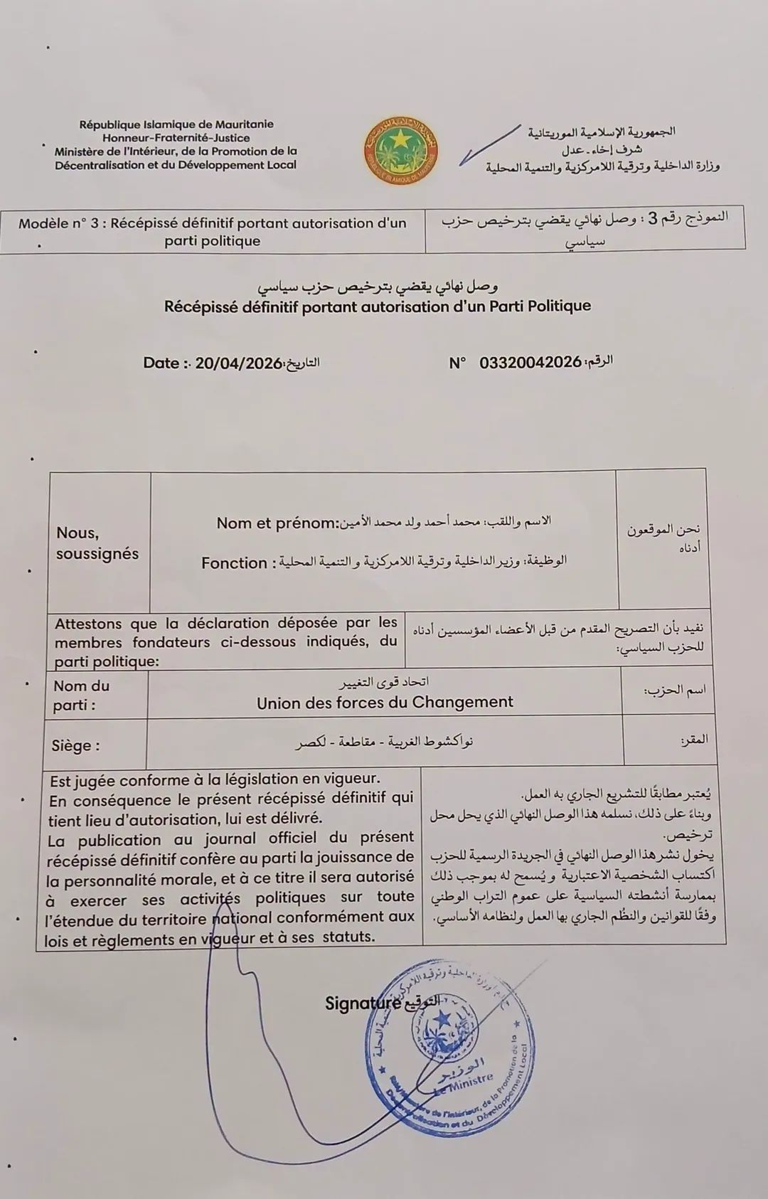 حصول حزب اتحاد قوى التغيير على الترخيص النهائي