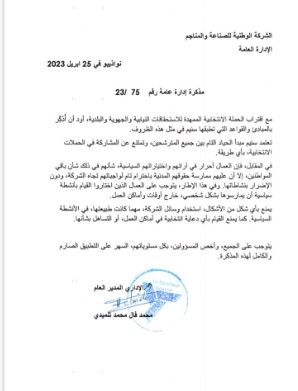 فقد أصدر الإداري المدير العام لشركة "سنيم" محمد فال محمد اتليميدي مذكرة إدارية قرر قيها "أن الشركة "تمتنع عن المشاركة في الحملات الانتخابية، بأي طريقة".