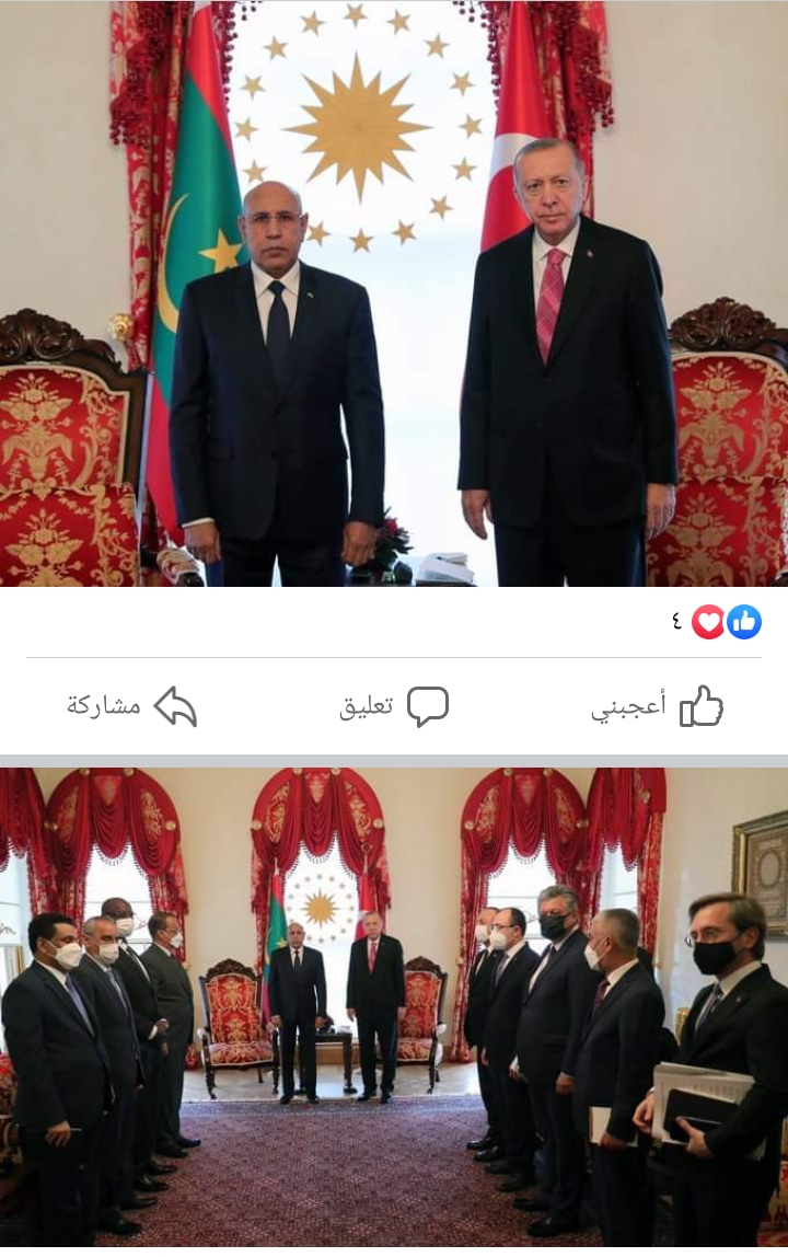 وحضر اللقاء من الجانب الموريتاني، الوزير الأمين العام لرئاسة الجمهورية، ووزير الشؤون الخارجية والتعاون والموريتانين في الخارج، ومدير ديوان رئيس الجمهورية، وسفيرنا في تركيا، ومن الجانب التركي وزبرا الشؤون الخارجية والتعاون والتجارة بالإضافة إلى سفير تركيا لدى بلادنا ورئيس المكتب الاعلامي للرئيس التركي وعدد من المستشارين بالرئاسة التركية.